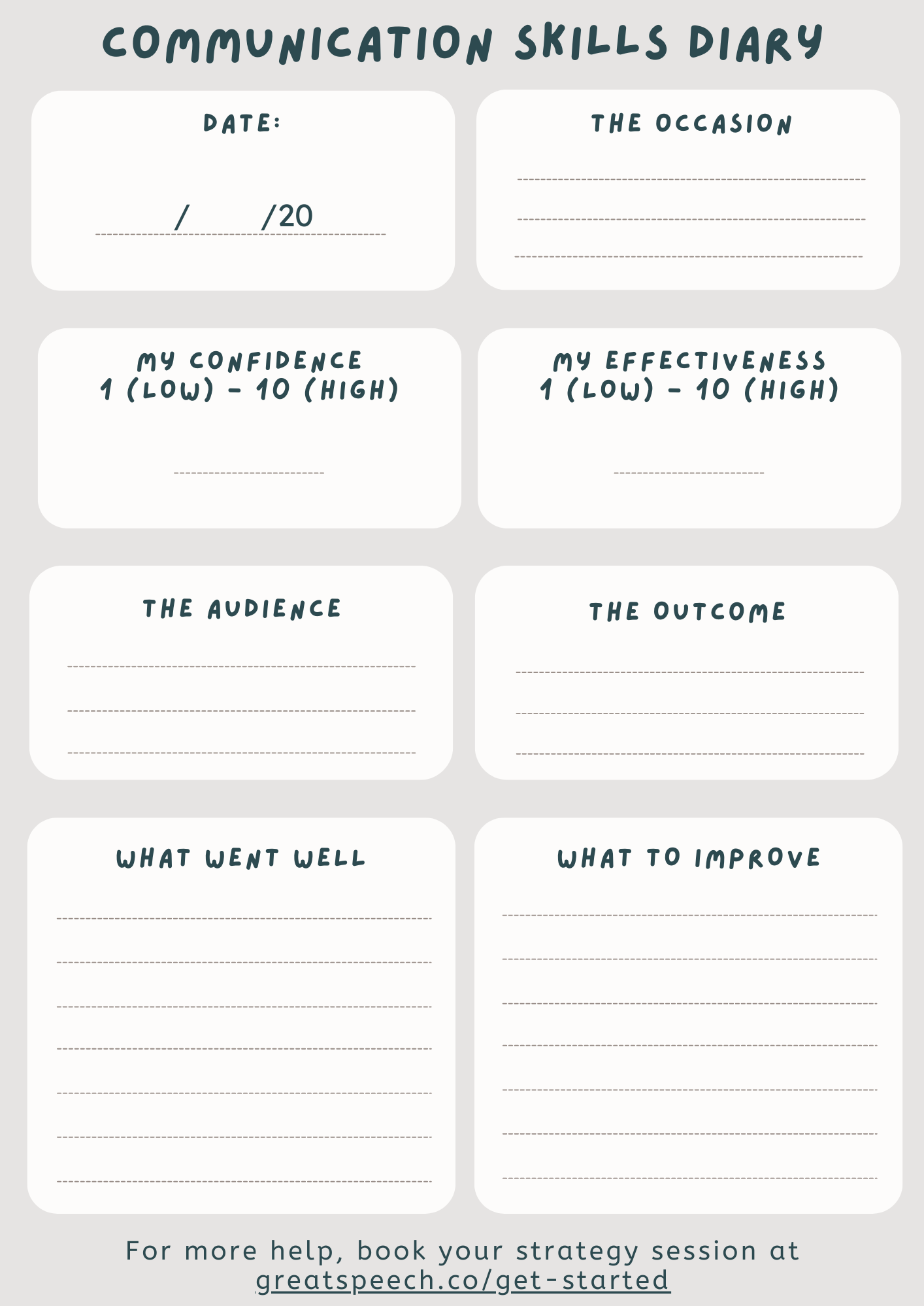 One of the most important habits I advise all my coaching clients to develop, is the habit of measuiring and tracking their communication journey. Use this simple 1 page Communication Skills Diary to keep a note of your performance and progress with your communication skills over time.